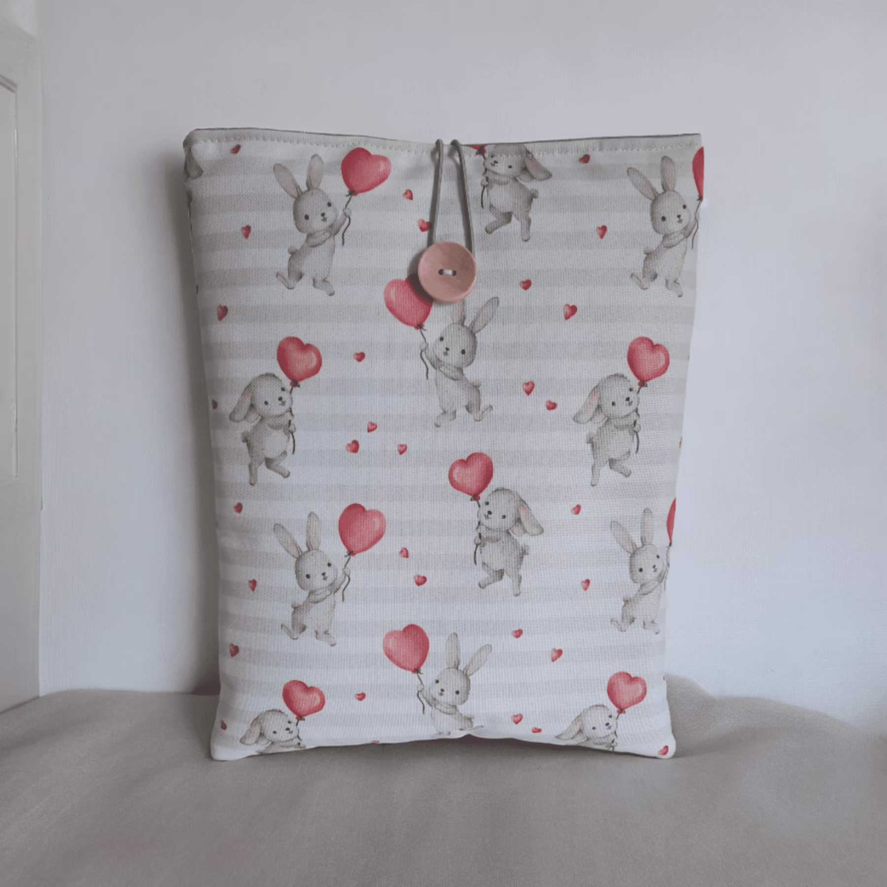 Pochette imperméable et molletonnée, faite main, idéale pour protéger vos livres, tablettes et liseuses. Avec son motif adorable de lapins amoureux, elle allie protection et style pour vos appareils et lectures préférés.