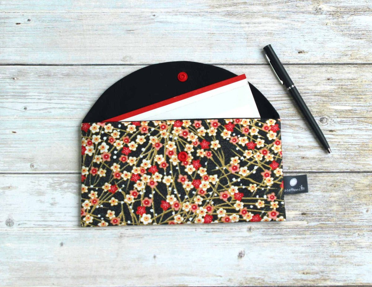 Pochette enveloppe en tissu coton à motifs japonais fleurs de cerisier, motifs légèrement dorés. Elle est doublée en coton épais noir et se ferme avec un rabat doté d’un bouton clip.