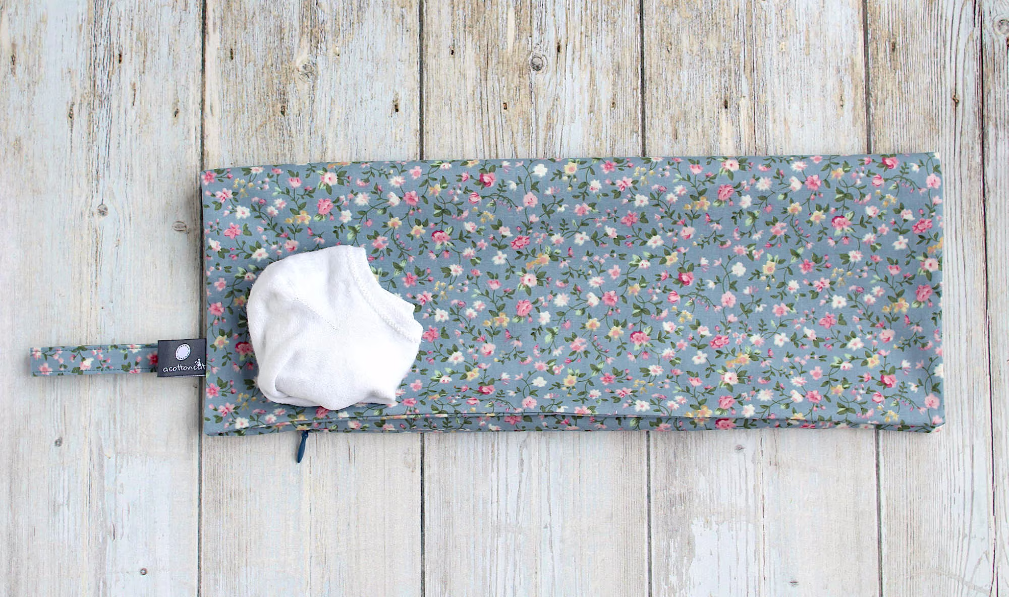 Grand pochon confectionné en coton motif fleurs et doté d’un fermeture zip invisible (fermeture à glissière).Â