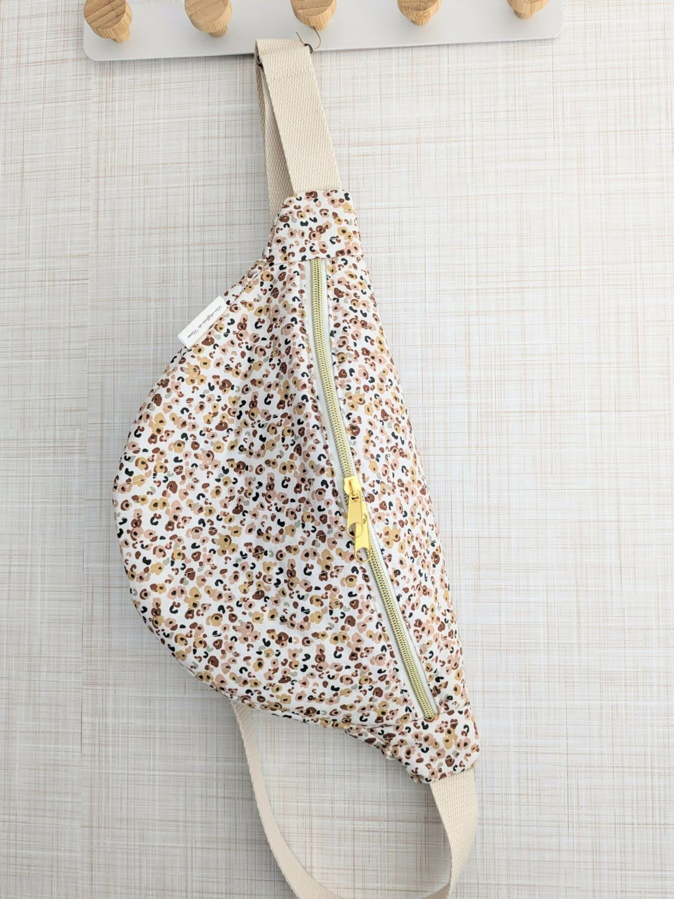 Sac banane en tissus léopard matelassé, doublure intérieur en coton beige avec une double poche intérieure et un petit cœur.