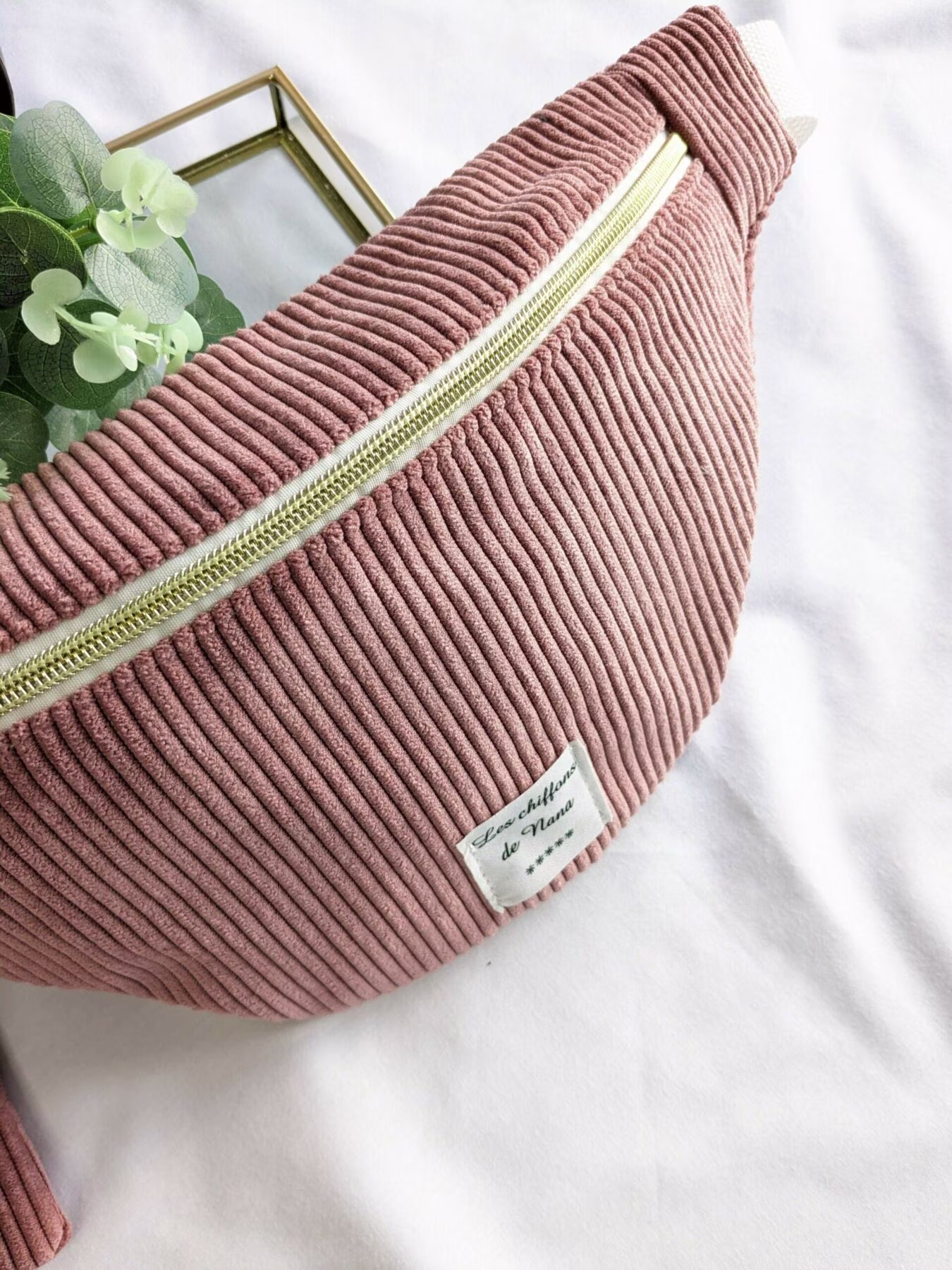 Sac banane en velours côtelé vieux rose et doublure fantaisie ou doublure couleur crème unie