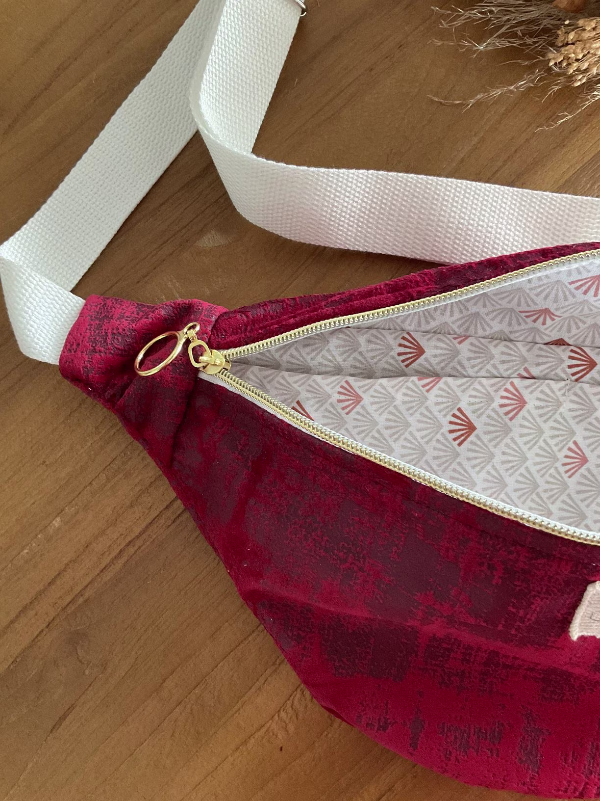 Sac banane fait main en velours rouge et relief noir.