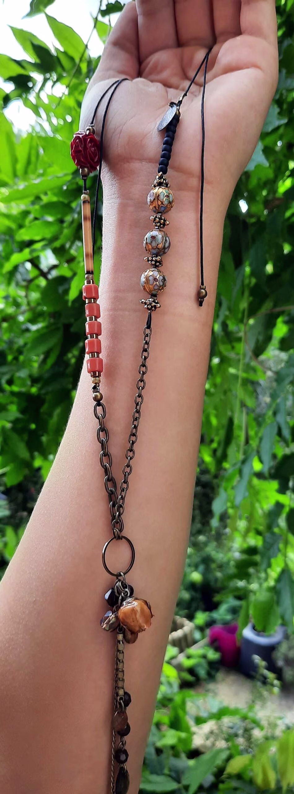 Ce sautoir, au style ancien et moderne à la fois”, se compose de perles anciennes dorées, rouges et bleu ciel, de perles de rocailles noires, de perles rondes en bronze , d’une breloque goutte filigrane noire, de perles de verre tube en cornaline, d’une perle plastique en forme de rose rouge, d’une perle tube en bambou, d’un pendentif anneau agrémenté d’une breloque chaîne et petites perles marrons fait main et de ce petit bouton de rose naturelle séchée et vernie que j’ai chiné.