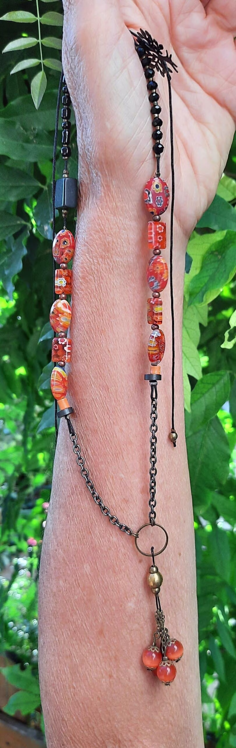 Ce sautoir, au style chic et moderne, se compose de perles ovales et rectangulaires millefiori oranges (bleues et jaunes), d’une perle plate et carré noire en Onyx, de perles de rocailles noires, de perles de verre à facettes noires, de perles tubes en bois oranges, de perles rondes en acier noires, d’une estampe “Arbre de vie” noire, de petites perles bronze et d’un pendentif anneau avec sa perle ronde en bronze et ses cinq chaînettes bronze et perles de verre oranges.