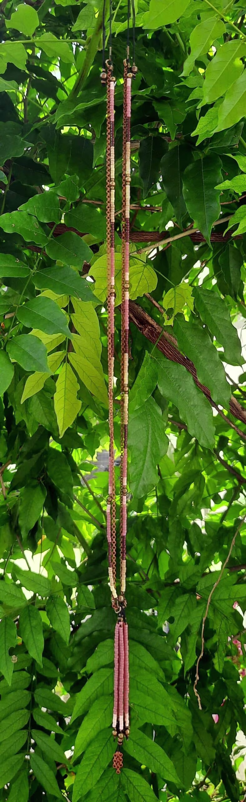 Ce sautoir est fait de deux rangs, une enfilade de perles “Miyuki” et de perles rondes en bronze, sur un fil de soie de 0,5 mn (très résistant) et une chaîne maillons forçat en cuivre.