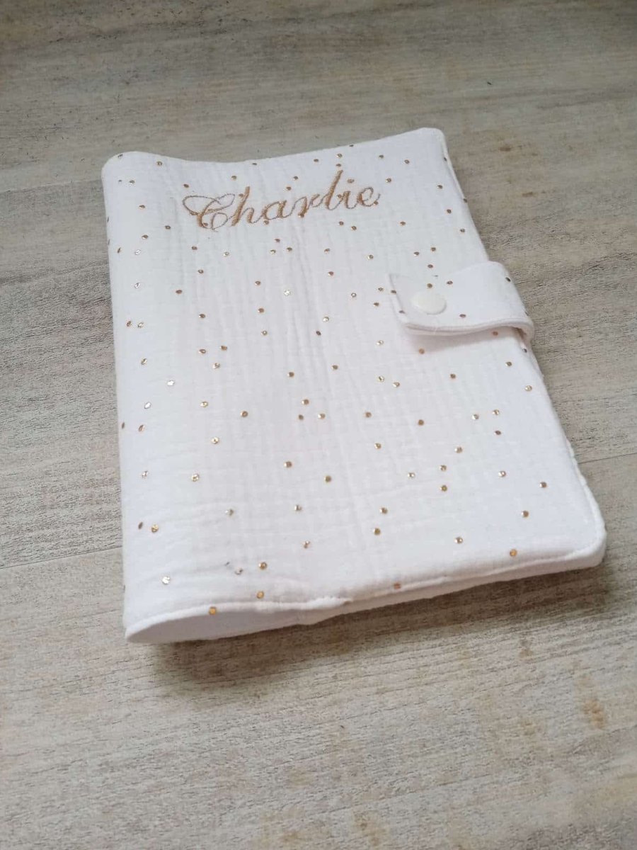 Protège carnet de santé double gaze de coton blanc pois dorés