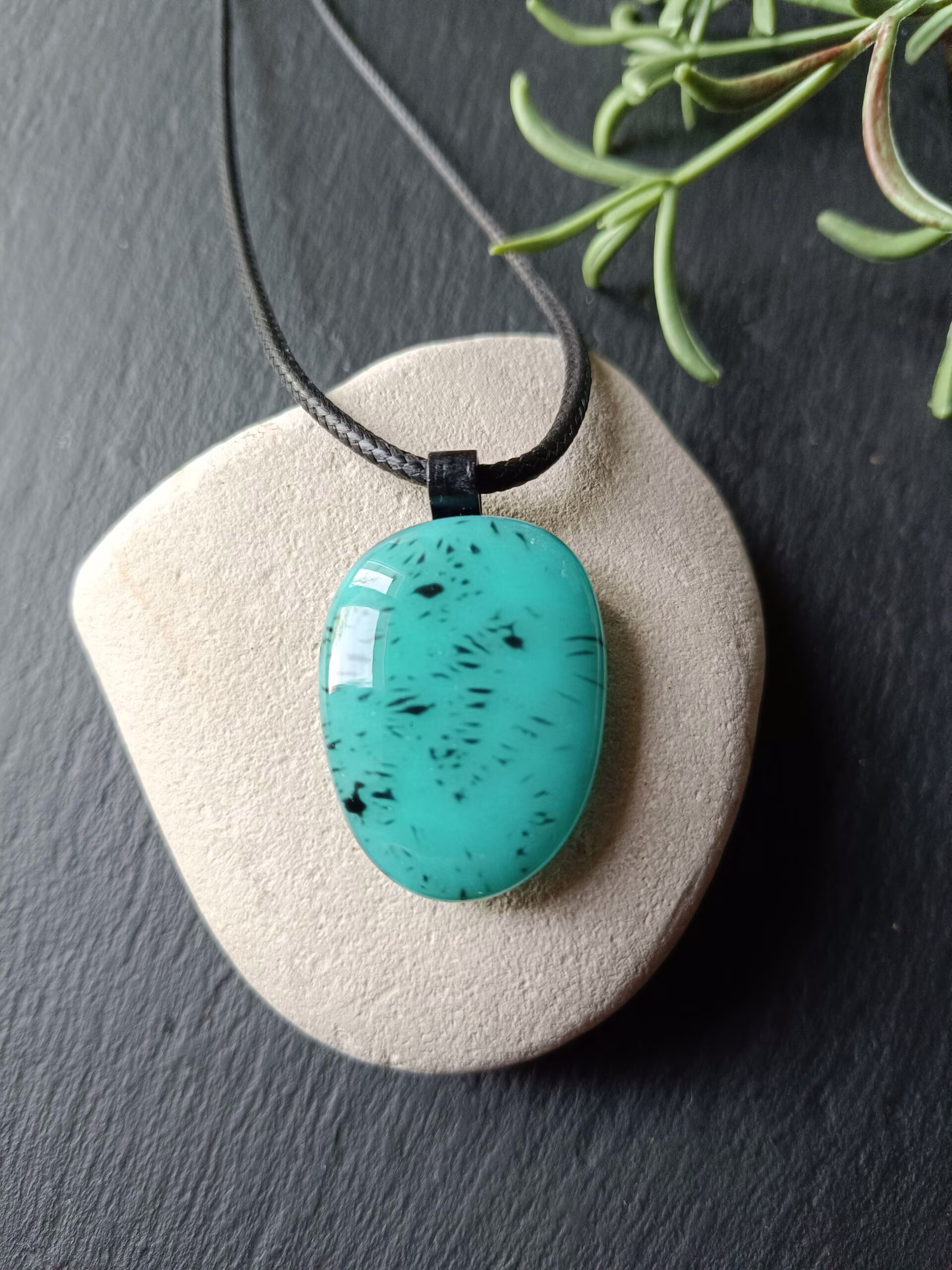 Pendentif noir et bleu en verre fusionné fait à la main avec collier en corde