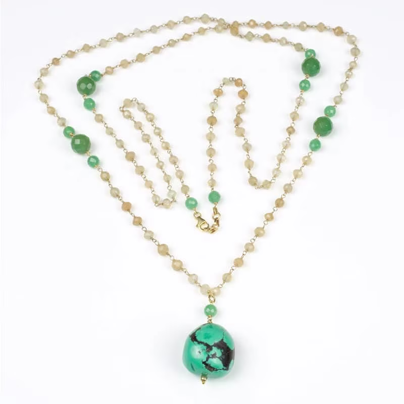 Sautoir chic et moderne, ajustable, perles pierres naturelles jade vert et rose et son pendentif pierres naturelles jaspe beige