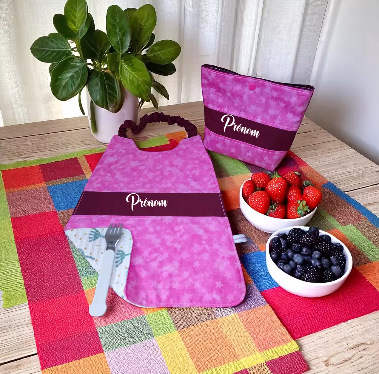 Serviette de table élastiquée avec prénom et sa pochette assortie