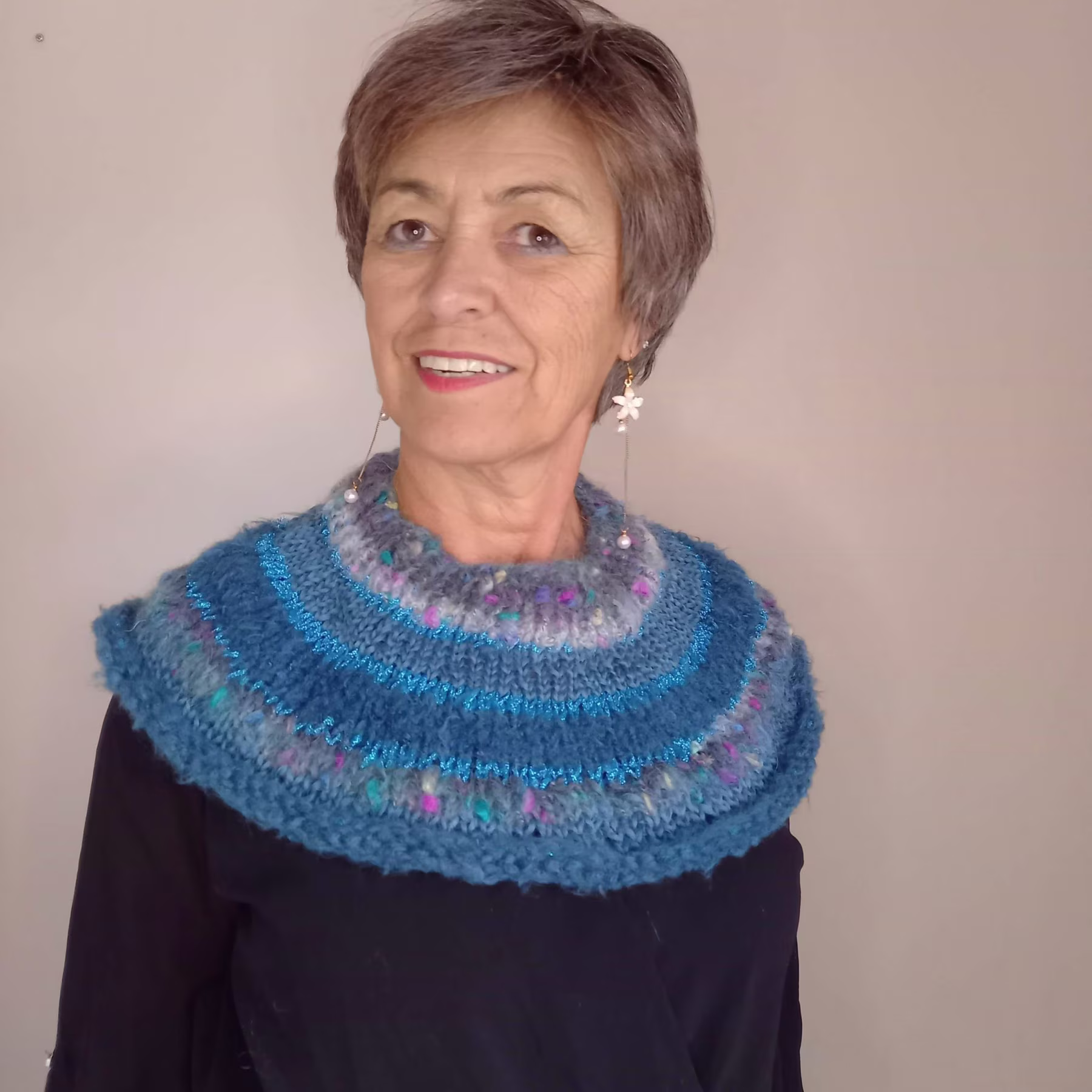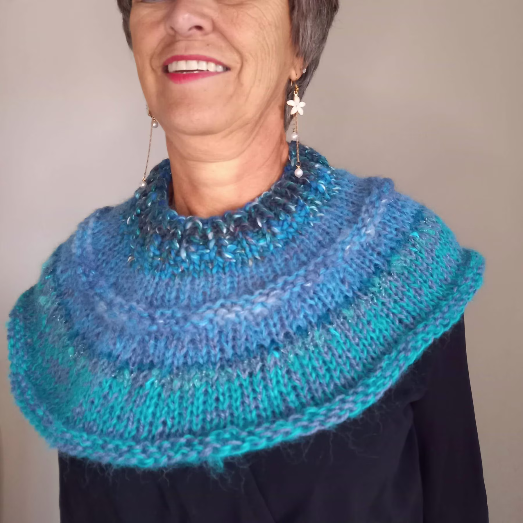 col femme chauffe épaule bleu vert et bleu tricoté en laine