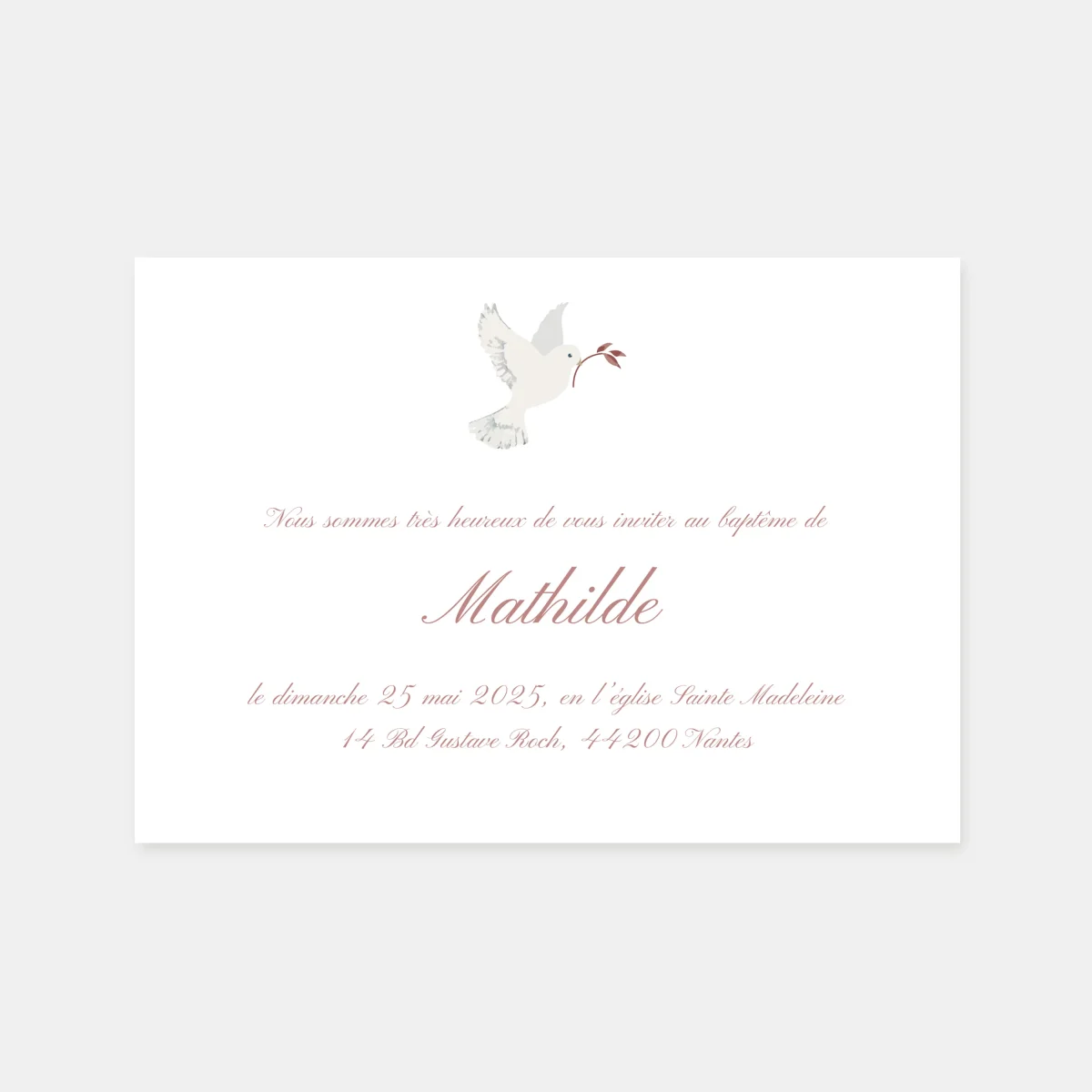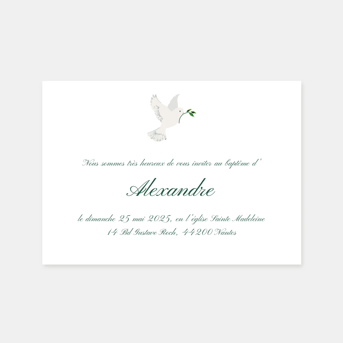 Faire-part de baptême classique colombe végétale
